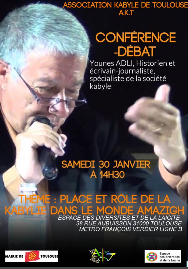 TOULOUSE (Tamurt) – A l’occasion du Nouvel an berbère, Yennayer 2966, l’Association Kabyle de Toulouse organise une conférence-débat avec l’écrivain-journaliste et historien, spécialiste de la société kabyle Younes ADLI