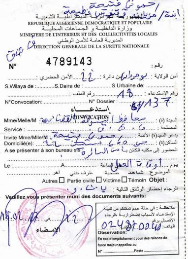 Elle est convoquée encore cette semaine par le commissaire de la sûreté de la wilaya de Boumerdès. Le motif de sa convocation n’est pas mentionné, mais les services de sécurité essayent par tous les moyens  de l’intimider à cause de sa défense pour Fekhar. L’avocate kabyle est sommée de se pérsenter au bureau du commissaire de police de Boumerdès le plus vote possible. Cette campagne contre maître Rahmouni est une atteinte flagrante à la liberté des avocats.