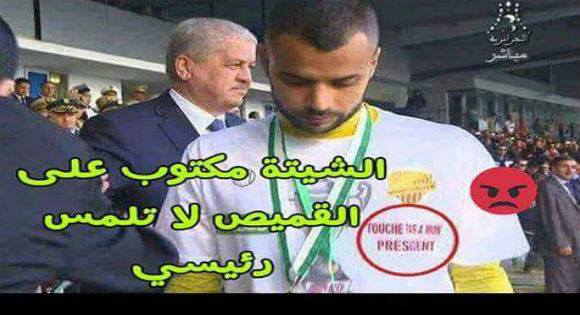 ALGERIE (Tamurt) – Le pouvoir d’Alger classe Boutef dans le clan des perdants Après la marche organisée à Tlemcen sous le slogan « Nous sommes tous des Bouteflika » en soutien à la momie d’El Mouradia, voilà que le pouvoir d’Alger décide d’imposer aux joueurs de l’équipe perdante de la coupe d’Algérie, le club d’Hussein Dey en l’occurrence, de se présenter, auprès de Sellal, le premier ministre algérien, pour la remise de médailles, vêtus de maillots frappés du slogan «Touche pas à mon président ».