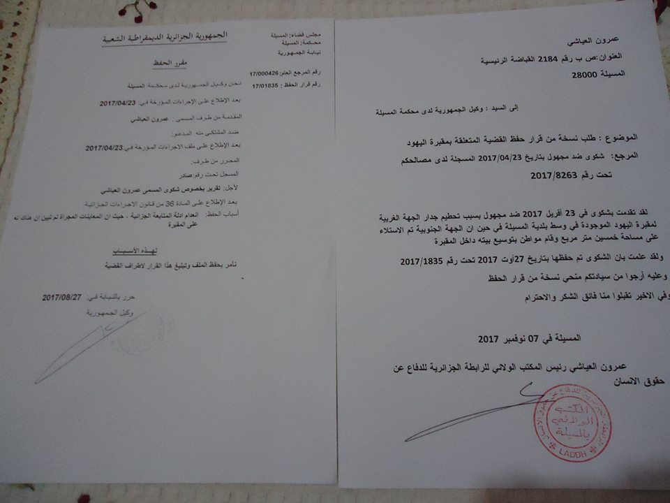 Le communiqué de cette affaire émis le 22 avril 2017 par le bureau des Droits de l’Homme de M’sila, à son tour, a fourni de fausses déclarations à mon encontre dont le but est de brouiller la vérité sur l’affaire du cimetière juif. Il rapporte que d’après le secrétaire général de la wilaya de M’sila, un comité a été formé à ce sujet, qui a conclu qu’il n’y avait pas de violation du cimetière, et que le citoyen a effectué une simple restauration de son domicile. J’ajoute que malgré mon droit de réponse dans le journal Liberté, le rédacteur en chef a refusé de publier ma réponse comme l’autorise la loi. En conséquence, la Ligue Algérienne pour la Défense des Droits de l’Homme Bureau de Msila (aile Saleh Debouz):